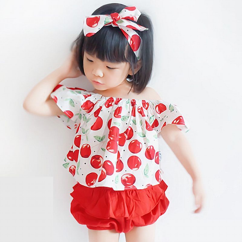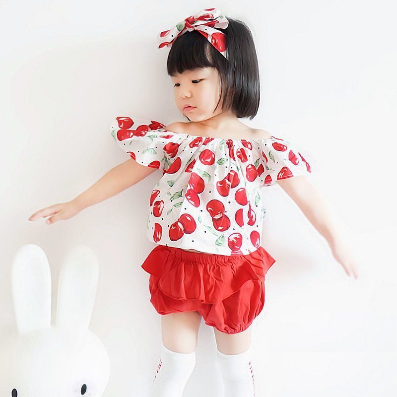 送料無料セットアップ 子供用 3点セット 上下セット ブラウス ブルマパンツ 半袖 ショートパンツ ヘアバンド付き サクランボ柄 女の子 キッズ ベビー